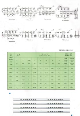 (2)現(xiàn)在靜音無聲齒形鏈條應(yīng)用越來越廣泛,高速無聲靜音低噪音鏈條齒輪應(yīng)用越來越普遍,有的人把原來的同步帶都換成這種無聲齒形鏈條,有的人使用滾子鏈條噪音太大,也在改成無聲齒形鏈條齒輪。有的高精密要求傳送傳遞精度高的輸送線也在采用無聲齒形鏈條齒輪,好多鍛造行業(yè)快速的傳送鍛造件也在采用無聲齒形鏈條,在輸送線上有好多需要平穩(wěn)輸送的也在采用無聲齒形鏈條作為輸送帶來輸送物件。目前齒形鏈條有一秒16米到30米,無聲齒形鏈條有單軸的,有雙軸的,節(jié)距有9.525毫米的型號CL06 SC3,12.7毫米的CL08 SC4 C4,15.875毫米的無聲齒形鏈條CL10,SC5 ,19.05毫米的CL12 SC6 ,25.4毫米的CL16,SC6;31.75毫米齒形鏈條CL20 SC10 ,無聲齒形鏈條38.1毫米CL24 .