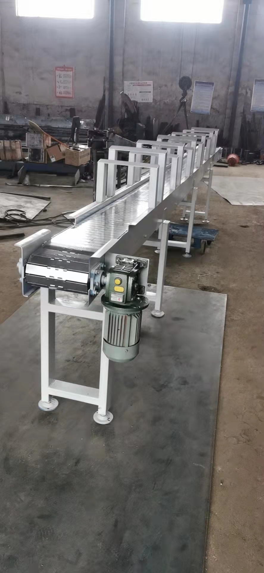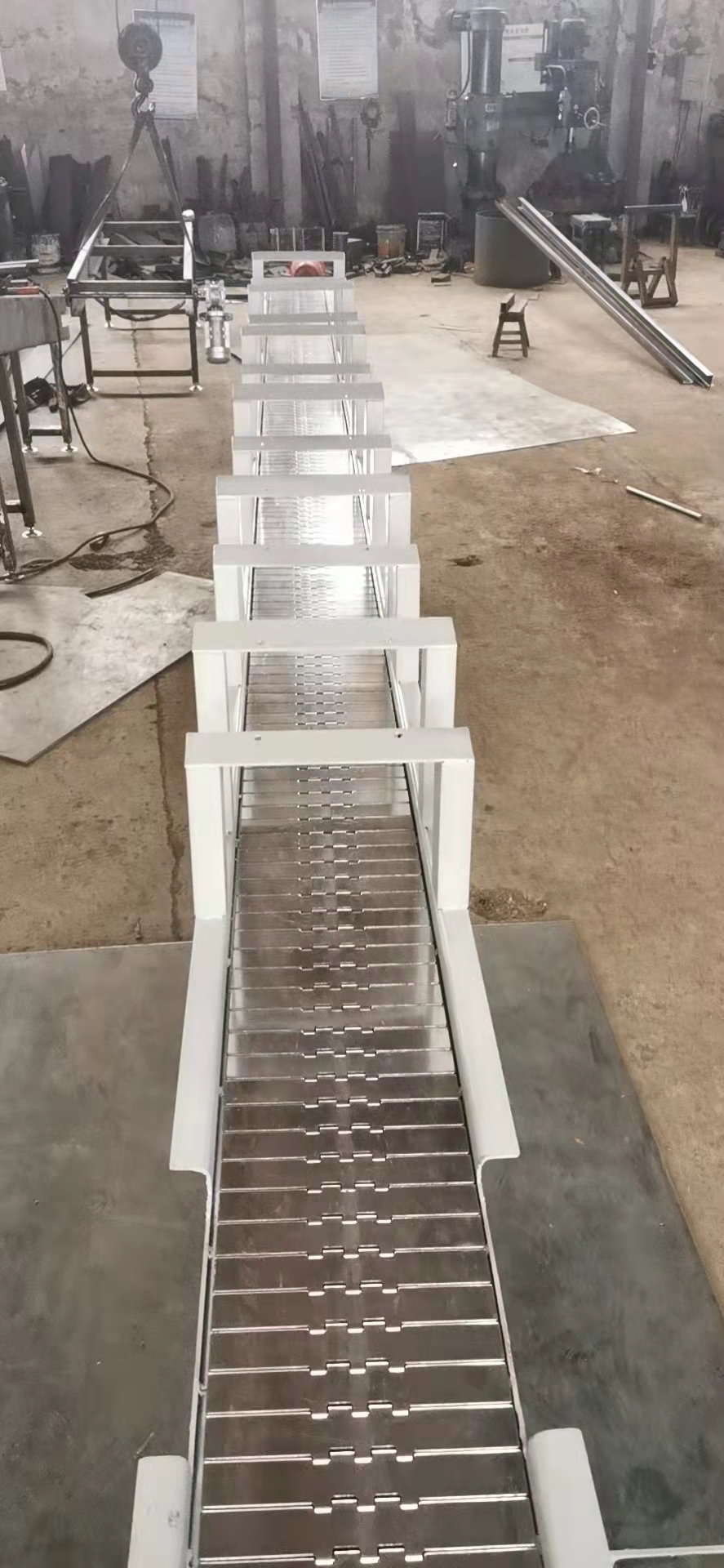 鍛造件鏈板輸送機是直接輸送高溫鍛造件的,其輸送帶必須能不怕熱,不變形,還耐高溫很強才可以承載鍛造件。我們采用的是耐熱的不銹鋼鏈板輸送帶。根據(jù)寬度不同,有平頂鏈鏈板輸送帶,合頁鏈板輸送帶和槽鋼鏈板輸送帶。已標準的頂板鏈或合頁鏈板輸送帶為承載面,以馬達減速機做動力傳動。