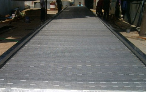 鏈板式輸送機(jī),利用固接在牽引鏈上的一系列鏈板在水平或傾斜方向輸送物料的輸送機(jī),以單片鋼板鉸接成環(huán)帶作為運(yùn)輸機(jī)的牽引和承載構(gòu)件承載面具有橫向隔片置于槽箱中驅(qū)動(dòng)環(huán)帶借隔片將煤刮運(yùn)輸出。它由驅(qū)動(dòng)機(jī)構(gòu)、張緊裝置、牽引鏈、板條、驅(qū)動(dòng)及改向鏈輪、機(jī)架等部分組成。在冶金、煤炭、化工、電力、機(jī)械制造及國(guó)民經(jīng)濟(jì)的其他工業(yè)部門(mén)中均得到了廣泛的應(yīng)用。