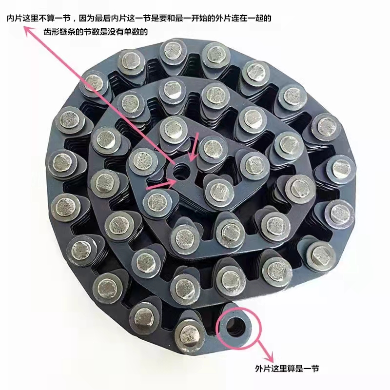 加鏈片排數(shù))。齒形鏈?zhǔn)且环N應(yīng)用廣泛的重要機械基礎(chǔ)件,主要用在高速、重載、低噪音、大中心距的工況下,其傳動性能優(yōu)于齒形帶傳動、齒輪傳動以及滾子傳動,以成為眾多行業(yè)對傳動形式之一,以嚙合形式分可分為內(nèi)嚙合齒形鏈、外嚙合齒形鏈和內(nèi)外復(fù)合嚙合齒形鏈,其中內(nèi)外復(fù)合嚙合齒形鏈的噪音最小,應(yīng)用也最廣泛