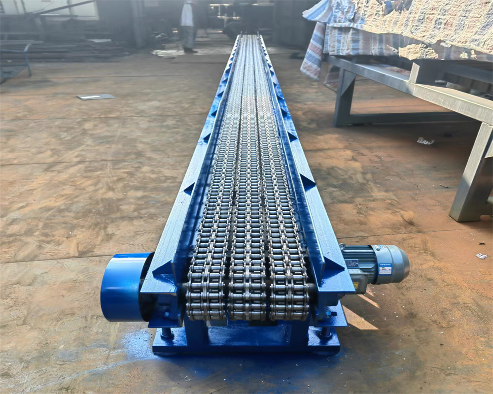 鏈條輸送機(jī) 輸送熱鍛造件的 長度8米 有效寬度220毫米 采用三根鏈條 變頻調(diào)速
