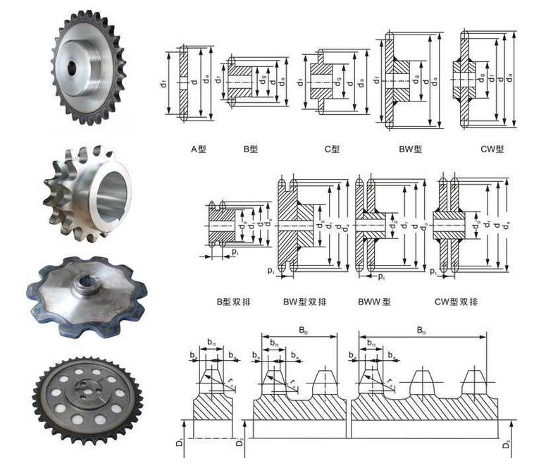 鏈輪軸面齒形兩側(cè)呈圓弧狀,以便于鏈節(jié)進(jìn)入和退出嚙合。齒形用標(biāo)準(zhǔn)刀具加工時(shí),在鏈輪工作圖上不必繪制端面齒形,但須繪出鏈輪軸面齒形,以便車削鏈輪毛壞。軸面齒形的具體尺寸見有關(guān)設(shè)計(jì)手冊(cè)。鏈輪齒應(yīng)有足夠的接觸強(qiáng)度和耐磨性,故齒面多經(jīng)熱處理。小鏈輪的嚙合次數(shù)比大鏈輪多,所受沖擊力也大,故所用材料一般應(yīng)優(yōu)于大鏈輪。常用的鏈輪材料有碳素鋼(如Q235、Q275、45、ZG310-570等)、灰鑄鐵(如HT200)等。重要的鏈輪可采用合金鋼。小直徑鏈輪可制成實(shí)心式;中等直徑的鏈輪可制成孔板式;直徑較大的鏈輪可設(shè)計(jì)成組合式,若輪齒因磨損而失效,可更換齒圈。