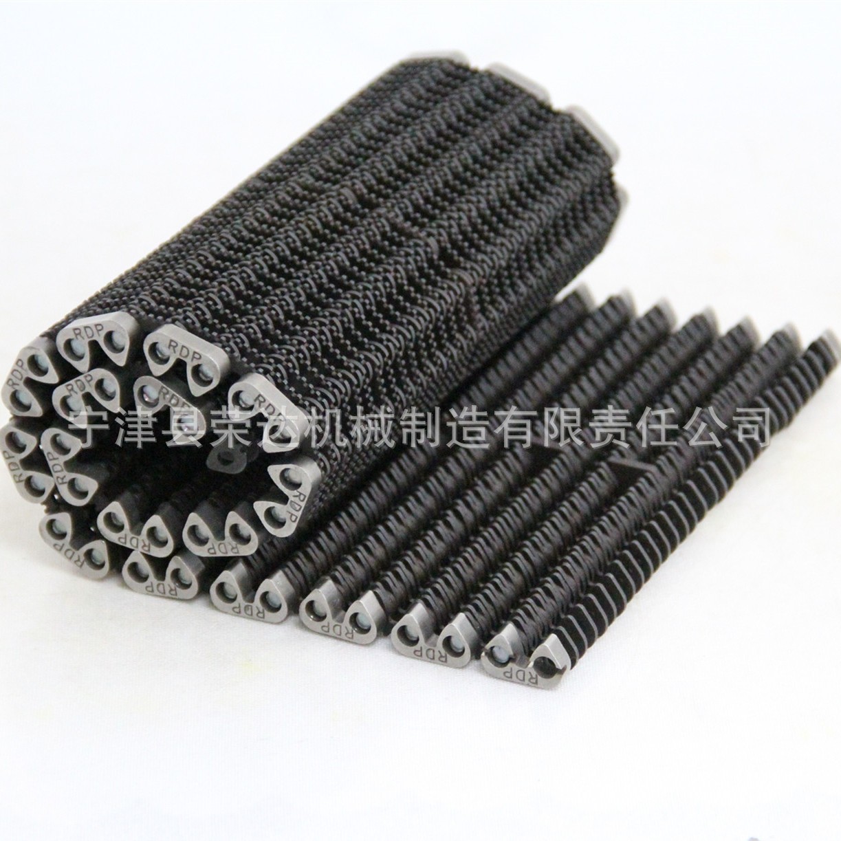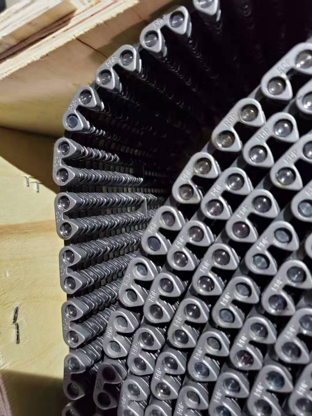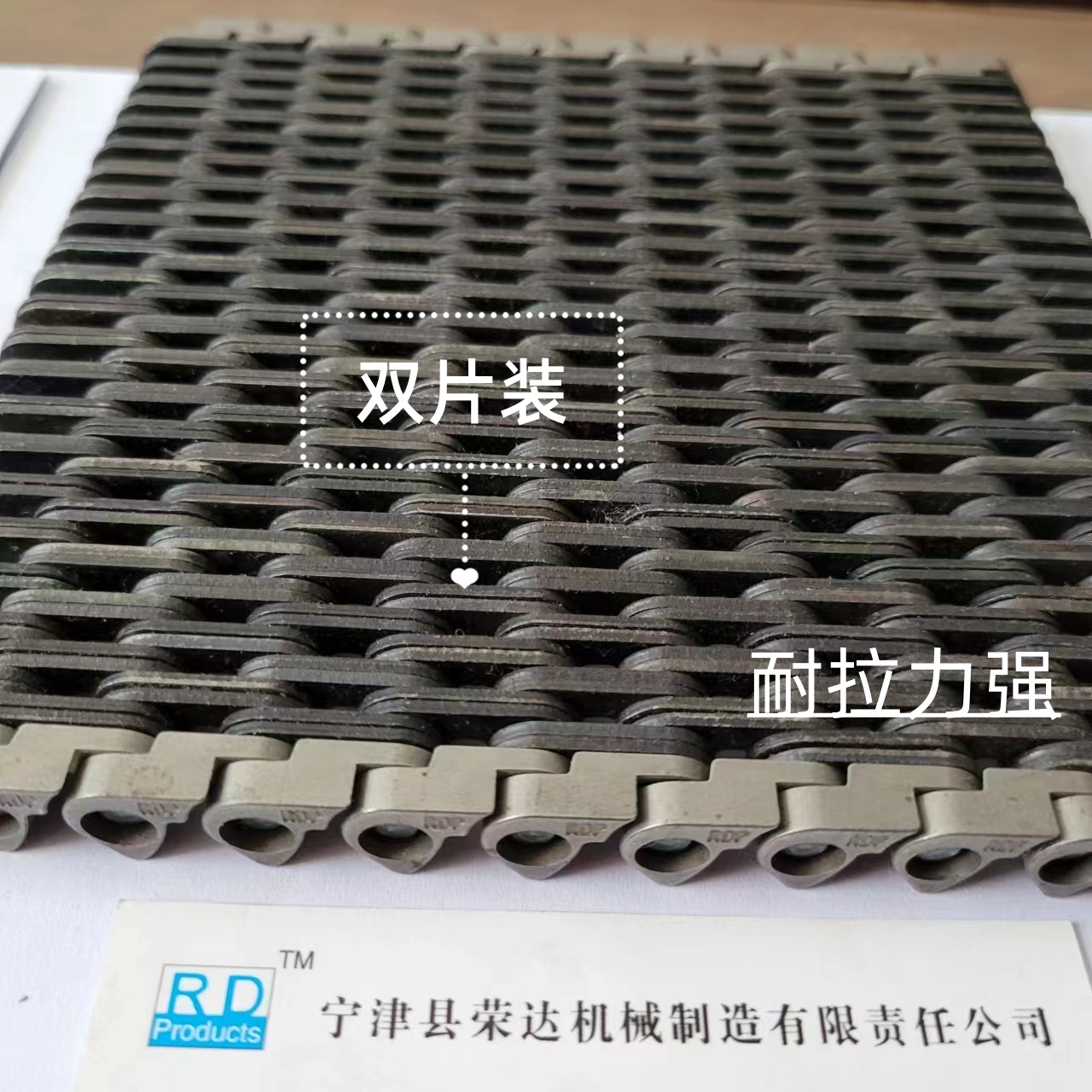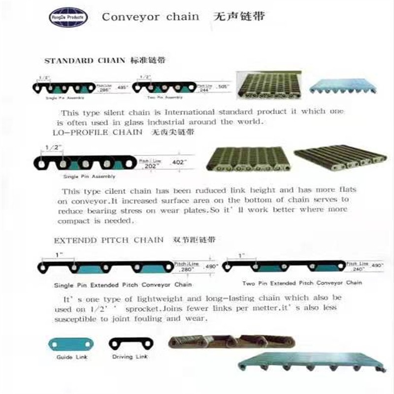 無聲齒形鏈帶:采用鏈條片和銷軸于墊圈做成的輸送用傳送帶,外形寬度非標(biāo)定做也有好多規(guī)格的現(xiàn)貨,鏈帶是用在玻璃廠輸送玻璃瓶罐器皿日用玻璃器皿的,也有的時候用在其他的輸送機械上,用來輸送其他產(chǎn)品,優(yōu)點就是平整,輸送面平穩(wěn),輸送高腳杯,不會倒瓶,用來輸送高溫玻璃制品,用于玻璃機械行列式制瓶機上,橫向輸瓶機,我們還研發(fā)了轉(zhuǎn)彎的拐彎的無聲齒形鏈帶,用于縱向拐彎橫向結(jié)合的輸送機上。無聲齒形鏈帶材質(zhì)有碳鋼的 錳鋼的 合金鋼的 ,節(jié)距有12.7毫米 25.4毫米 單軸的和雙軸的,無齒形鏈帶從外形看有內(nèi)導(dǎo)向和外導(dǎo)向,有帶保護帽的和不帶保護帽的,無聲齒形鏈帶有帶尖的和不帶尖的.